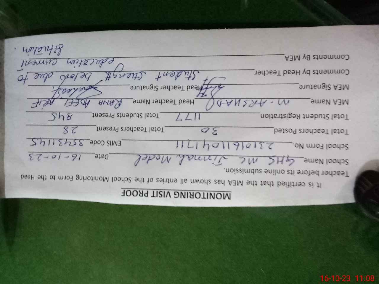 | Certified that this School was Inspected by the Undersigned MEA/DMO Today and the Information Stated Above is as Per Record. | |||||