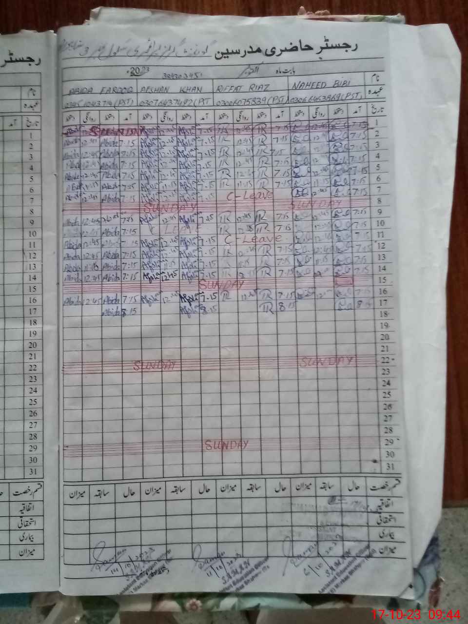 | CNIC | Full Name | Designation | R/C | Absence During Last Calender Month |