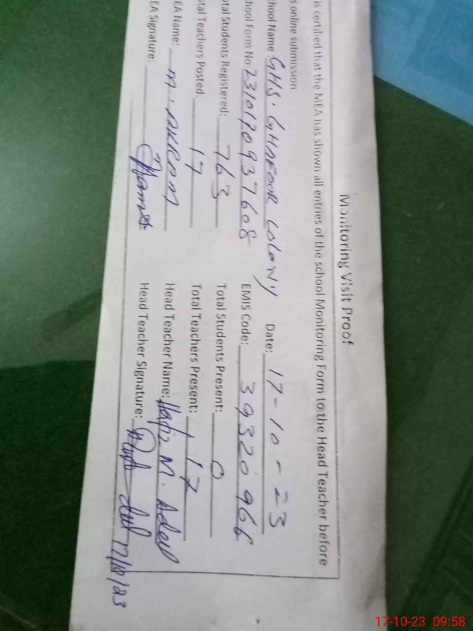 | EMIS Code: 39320966 | Name of School: GHS MC GHAFOOR COLONY OKARA | |||