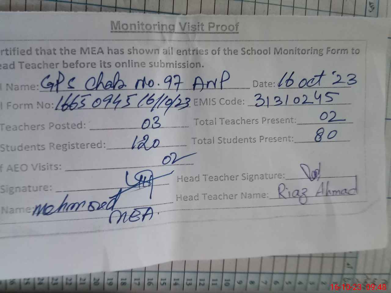 | Attendance Register | Head Teacher | MEA with School | Visit Proof |