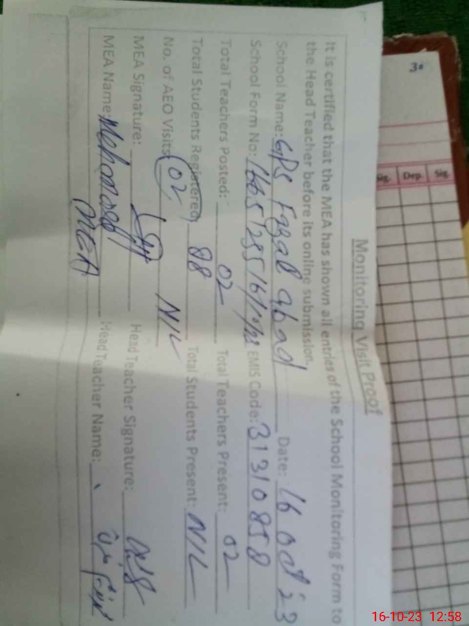 | EMIS Code: 31310858 | Name of School: GPS FAZAL ABAD | |||
