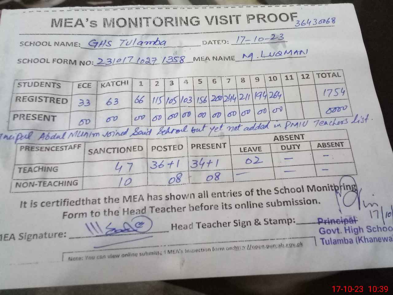 | Remarks (Use Separate Page if Required): Principal Abdul Munim joined said school on 25 September but yet not added in teachers list All teachers were on strike | |||||