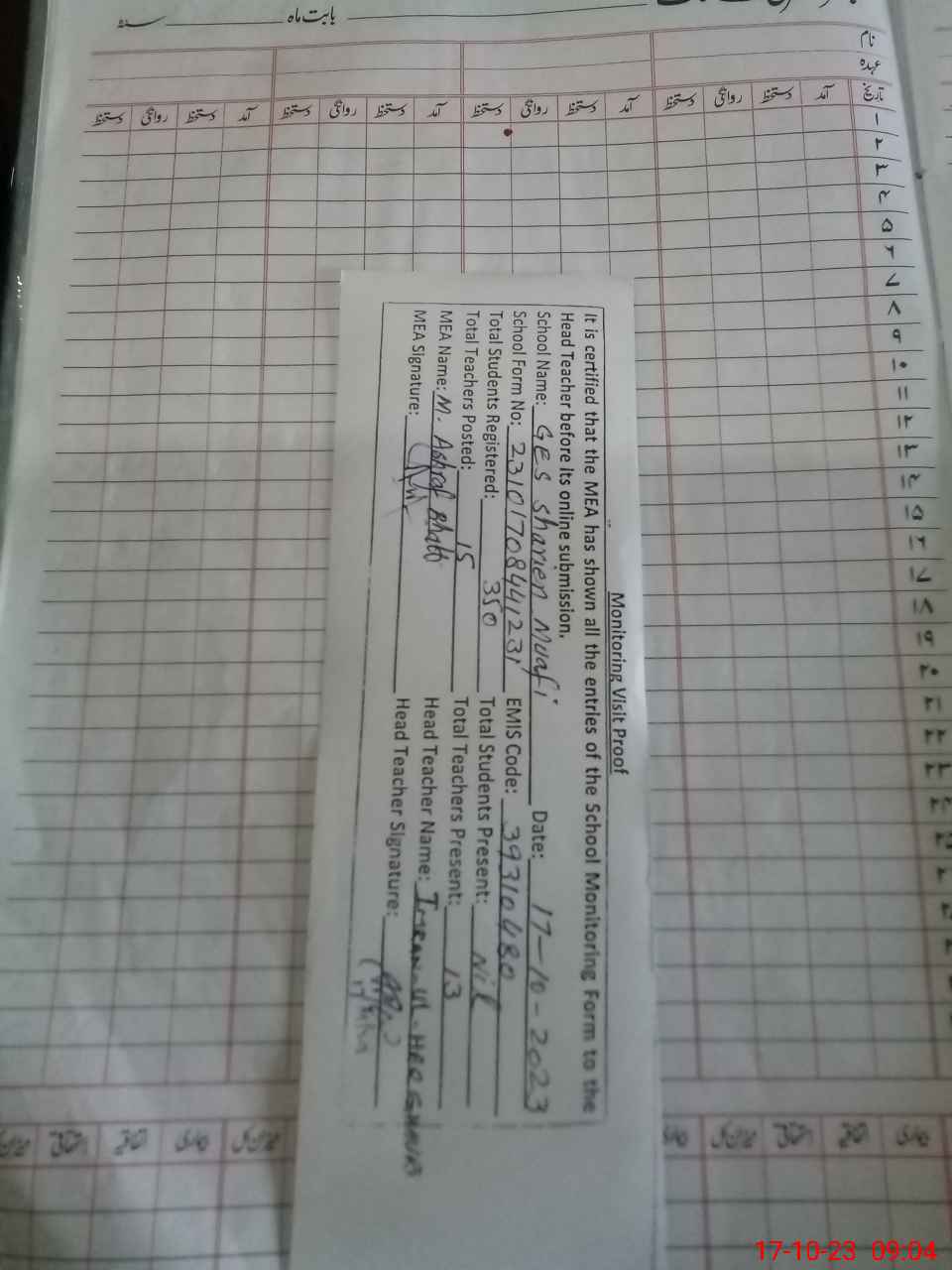 | Attendance Register | Head Teacher | MEA with School | Visit Proof |
