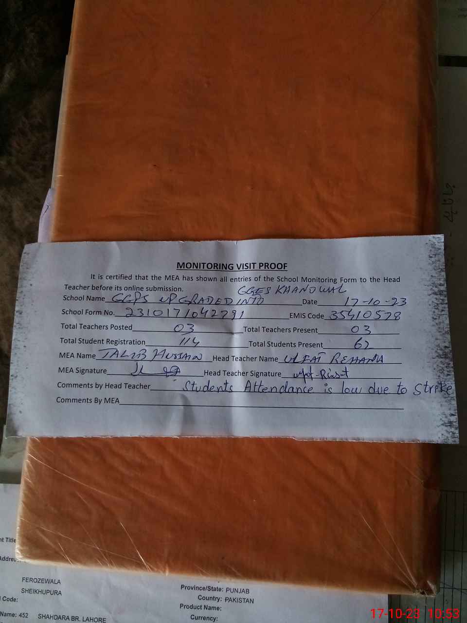 | Attendance Register | Head Teacher | MEA with School | Visit Proof |