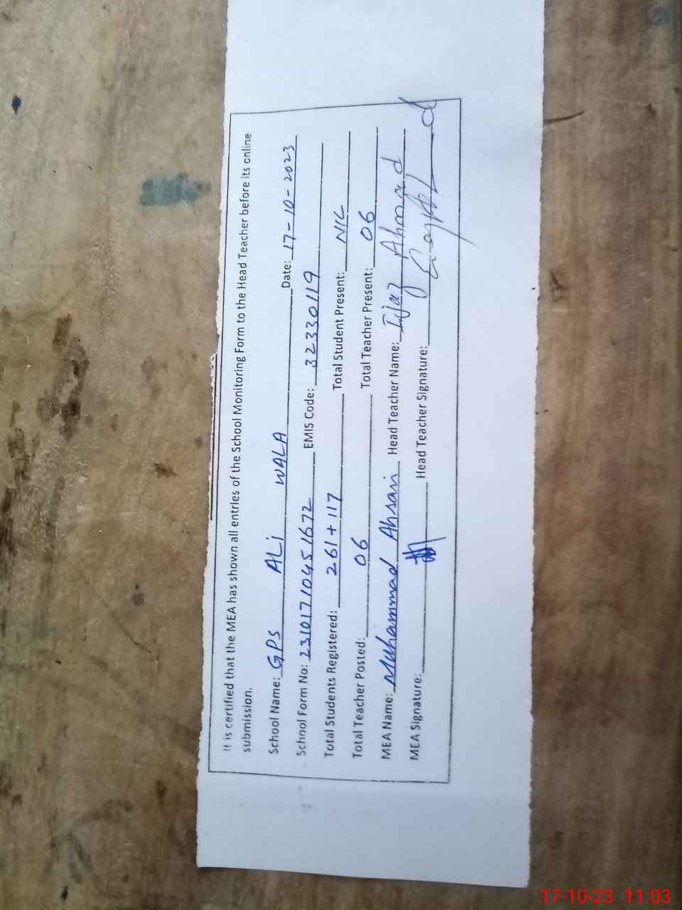 | Attendance Register | Head Teacher | MEA with School | Visit Proof |