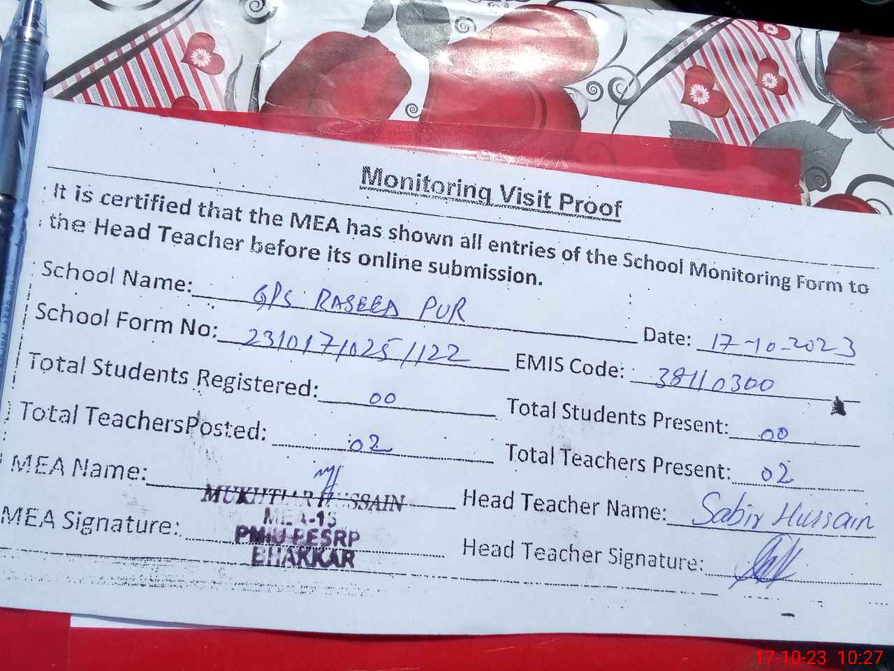 | EMIS Code: 38110300 | Name of School: GPS RASEED PUR | |||