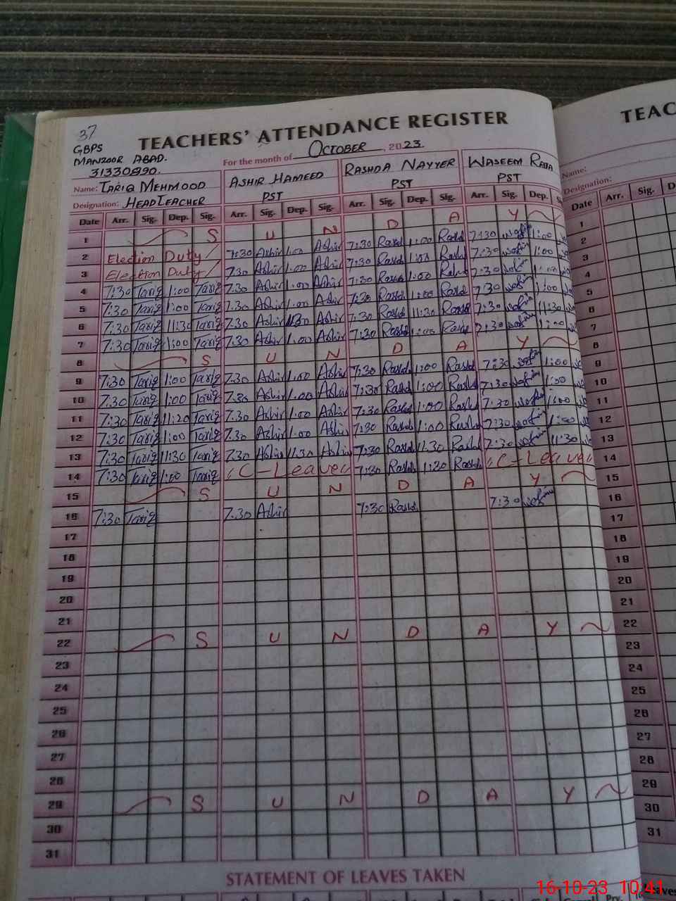 | Leave | Duty | Absent | Maternity | Medical | Ex- Pak |
