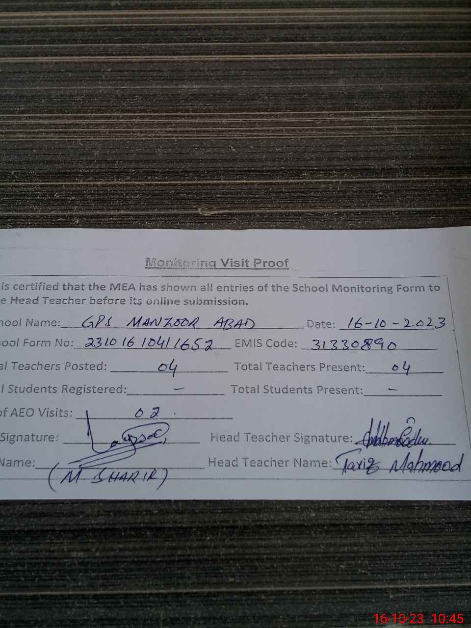 | Attendance Register | Head Teacher | MEA with School | Visit Proof |