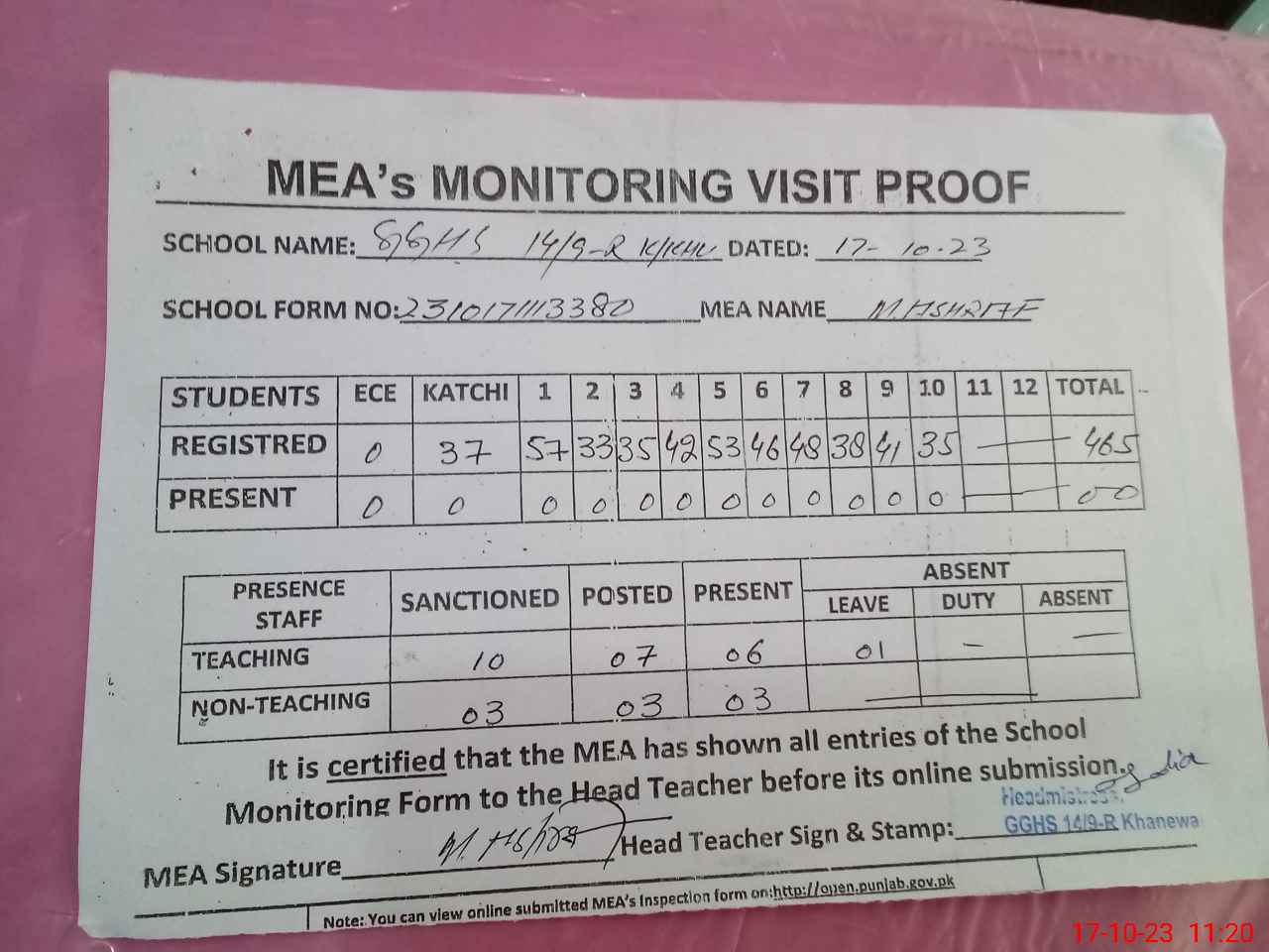 | EMIS Code: 36420123 | Name of School: GGHS 14/9-R, KACHA KHUH | |||
