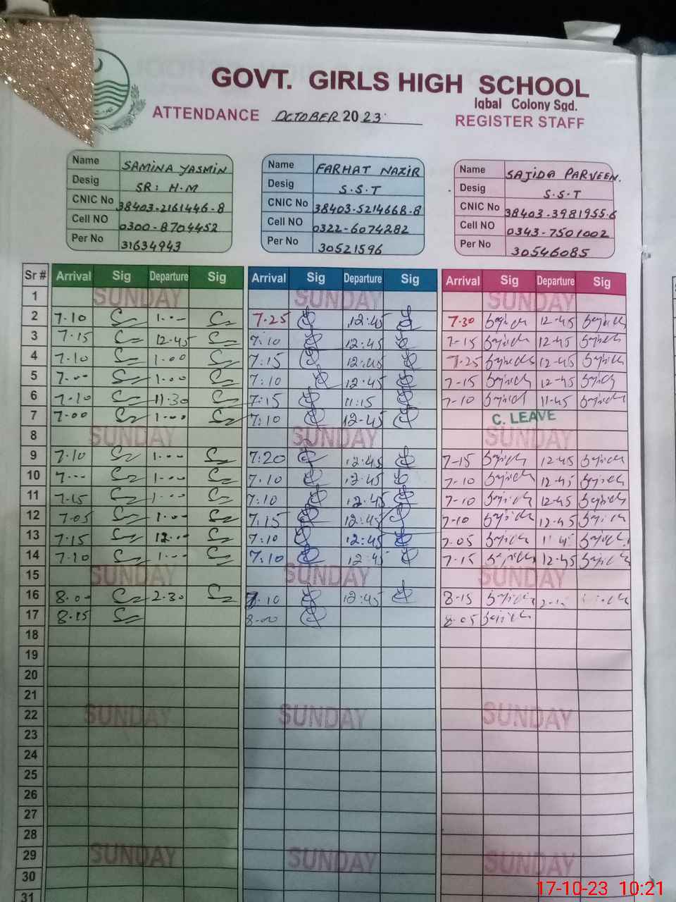| CNIC | Full Name | Designation | R/C | Absence During Last Calender Month |