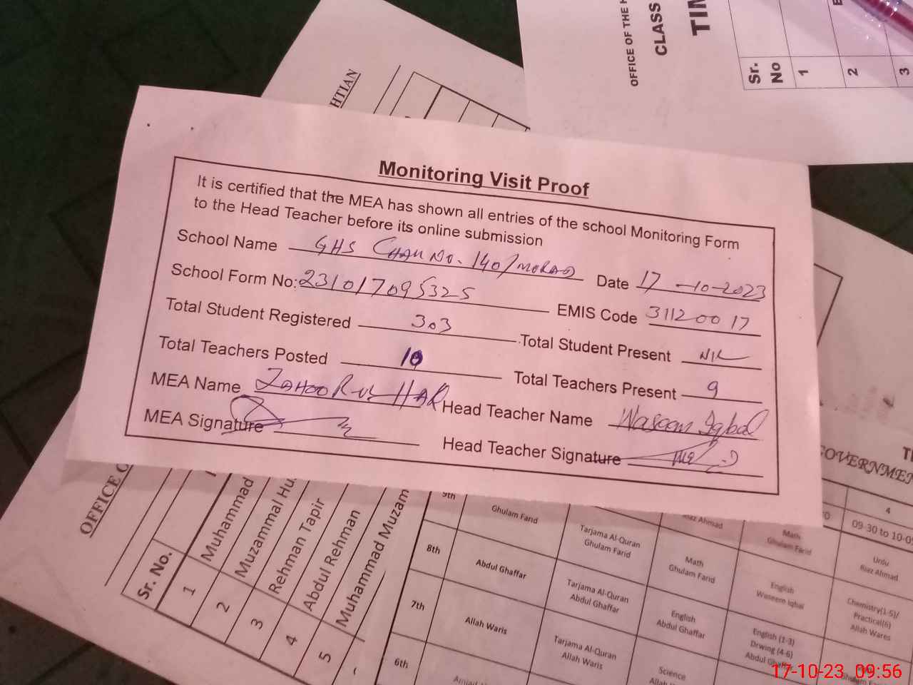 | Attendance Register | Head Teacher | MEA with School | Visit Proof |