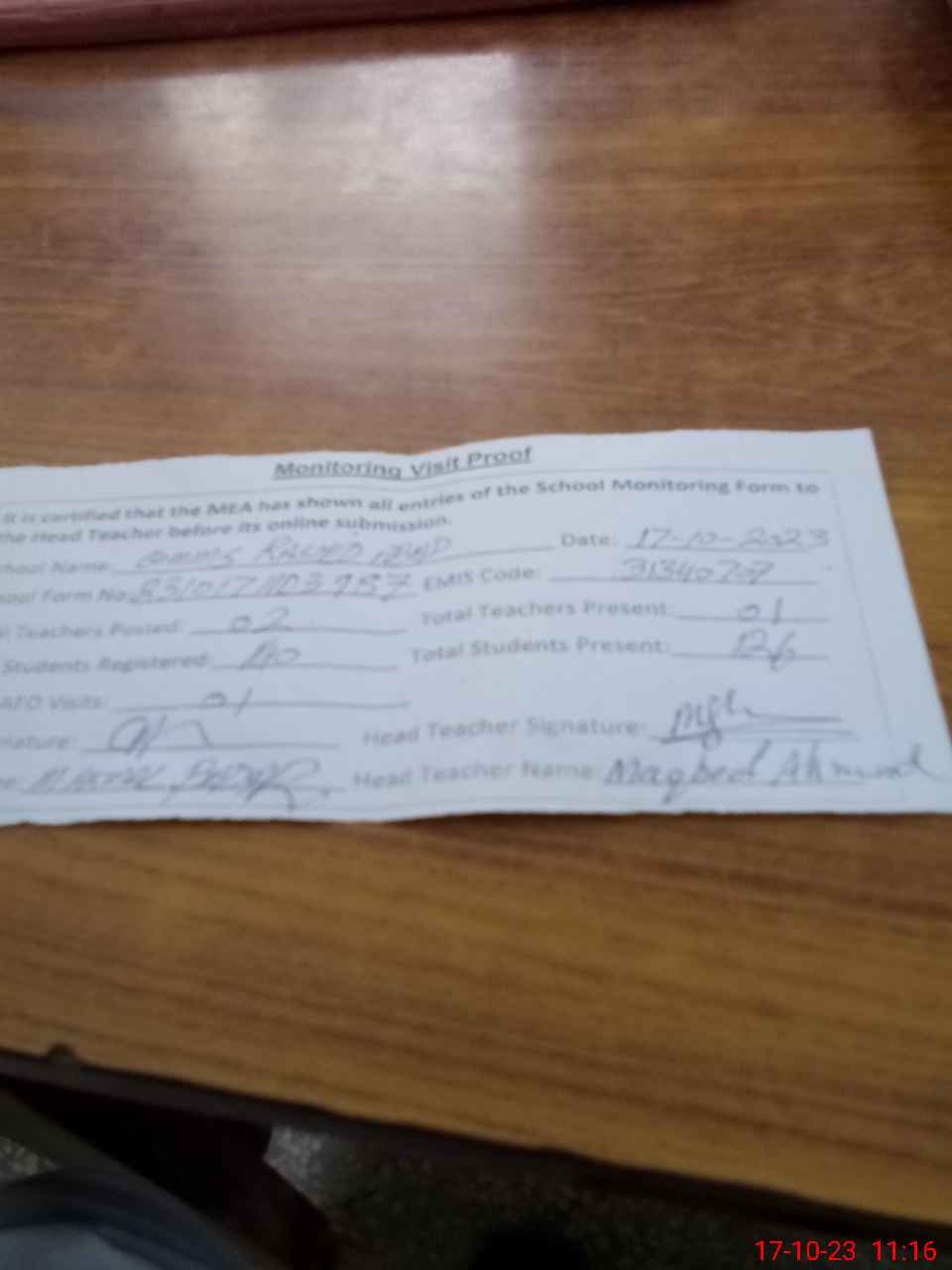 | Attendance Register | Head Teacher | MEA with School | Visit Proof |