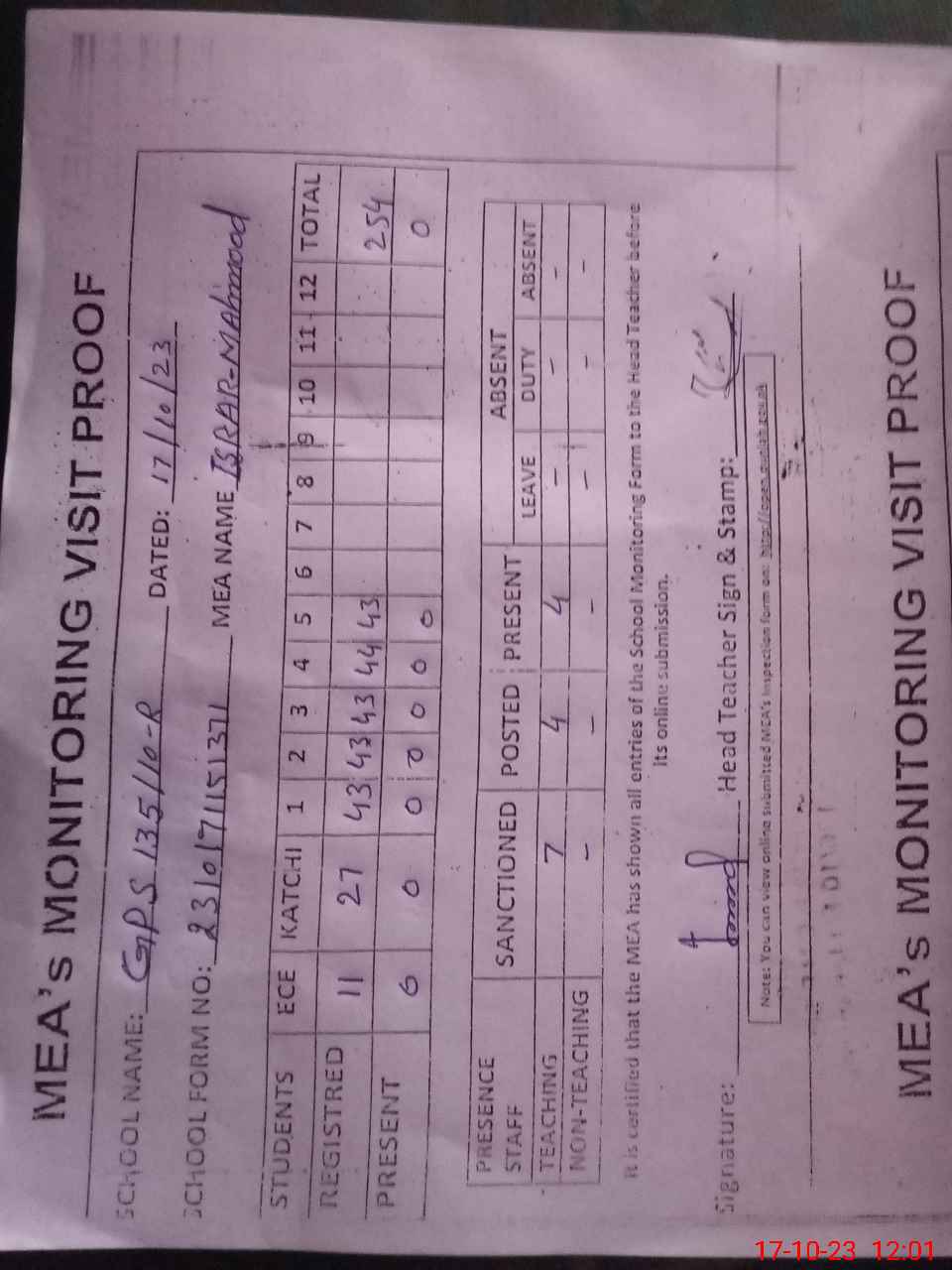 | Attendance Register | Head Teacher | MEA with School | Visit Proof |
