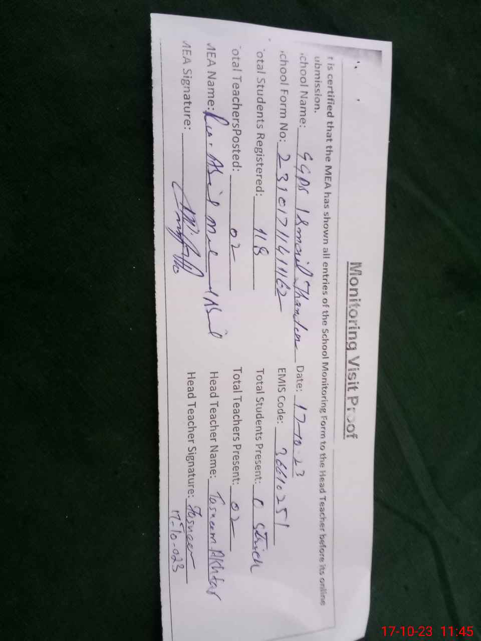 | Attendance Register | Head Teacher | MEA with School | Visit Proof |