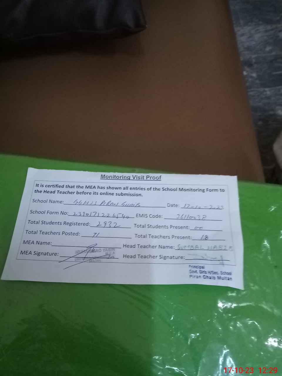 | Monitoring Date: 17-10-2023 | Start Time: 17-10-2023 11:31 AM | End Time: 17-10-2023 12:35 PM | Name of MEA: MU**** YA**** | |