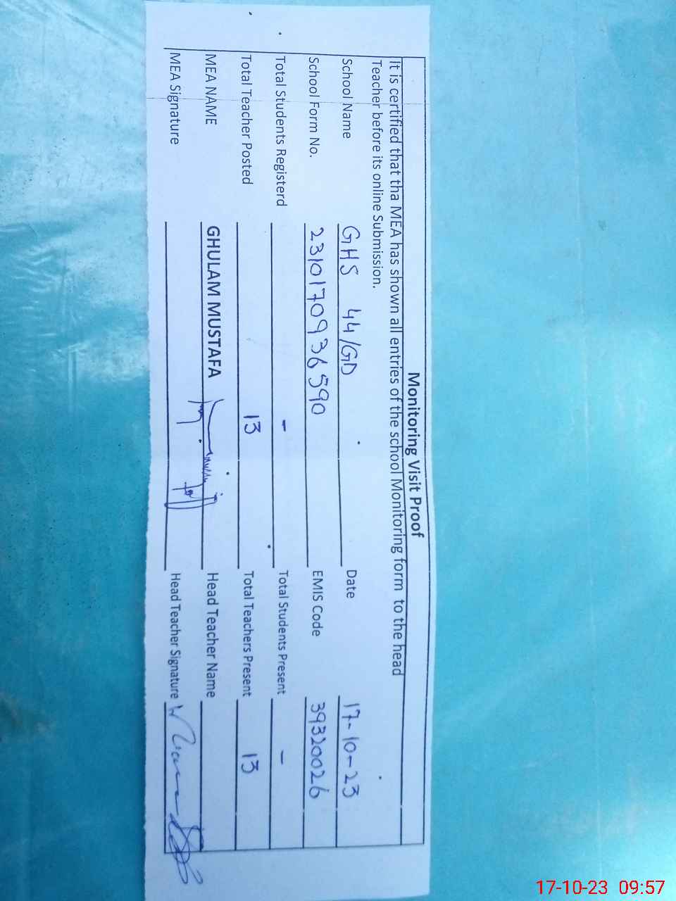 | Attendance Register | Head Teacher | MEA with School | Visit Proof |