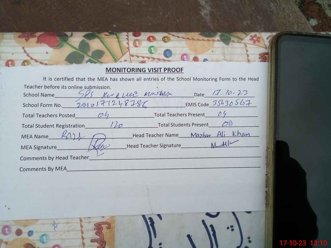 | Attendance Register | Head Teacher | MEA with School | Visit Proof |