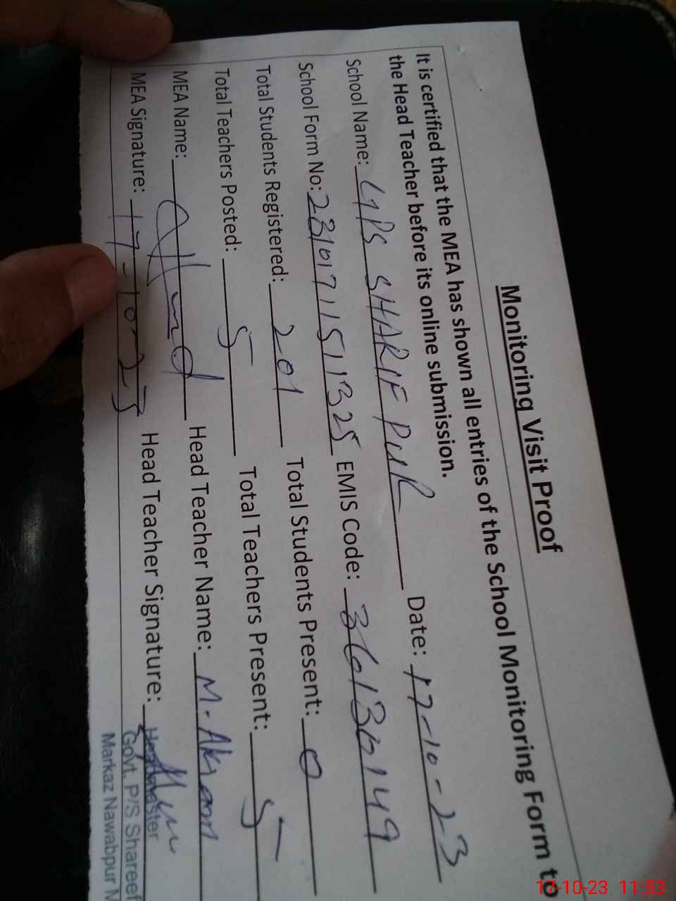 | EMIS Code: 36130149 | Name of School: GPS SHARIF PUR NAWAB PUR MULTAN | |||