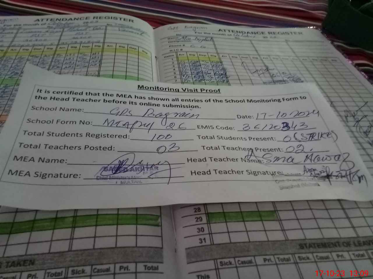 | Attendance Register | Head Teacher | MEA with School | Visit Proof |