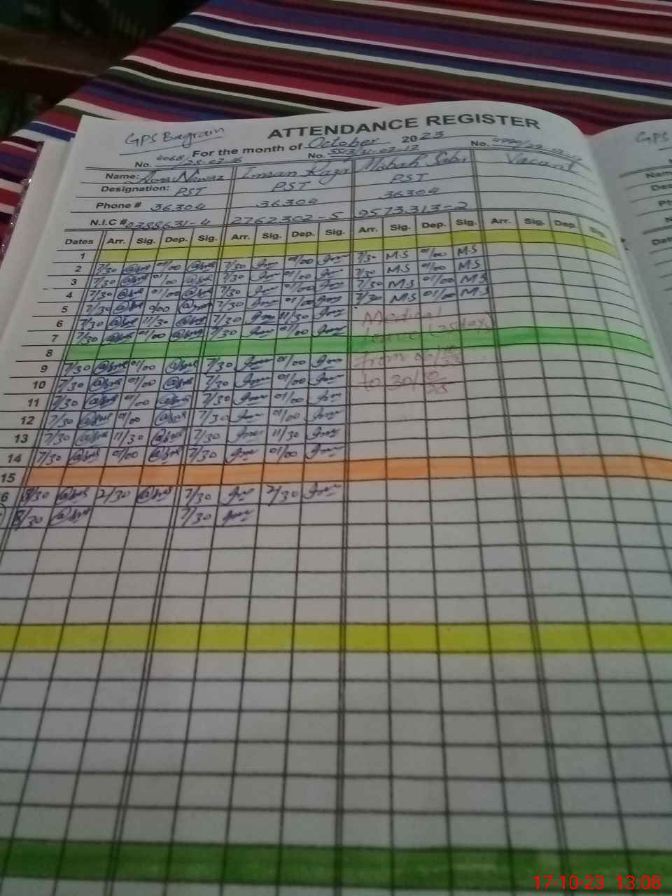 | CNIC | Full Name | Designation | R/C | Absence During Last Calender Month |