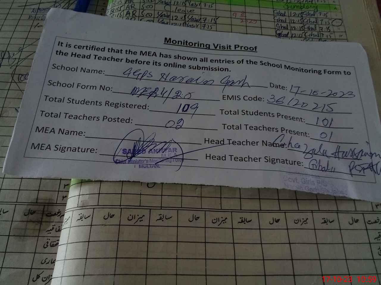 | Attendance Register | Head Teacher | MEA with School | Visit Proof |