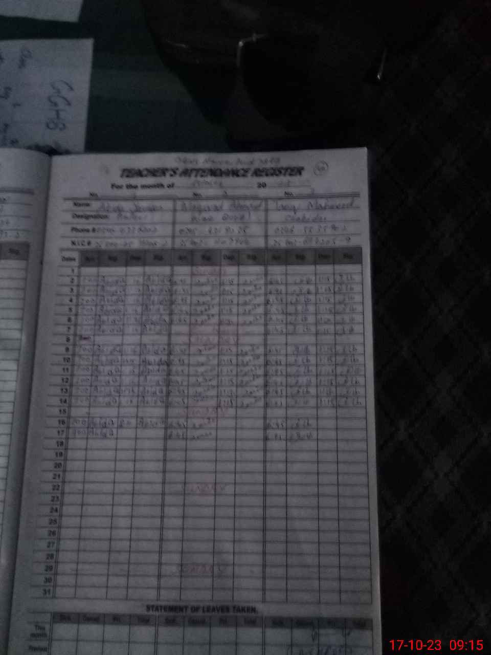 | CNIC | Full Name | Designation | R/C | Absence During Last Calender Month |