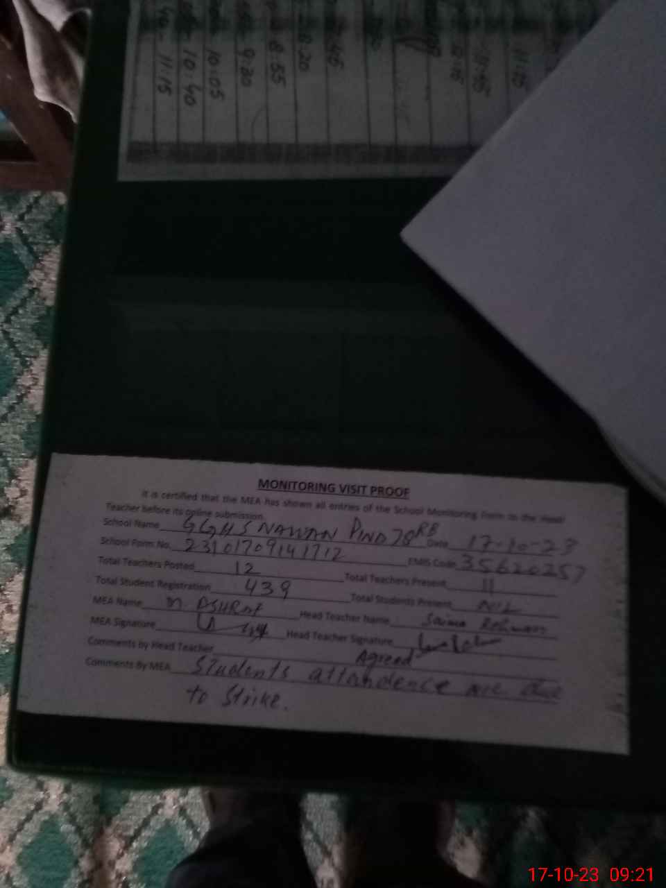 | Attendance Register | Head Teacher | MEA with School | Visit Proof |