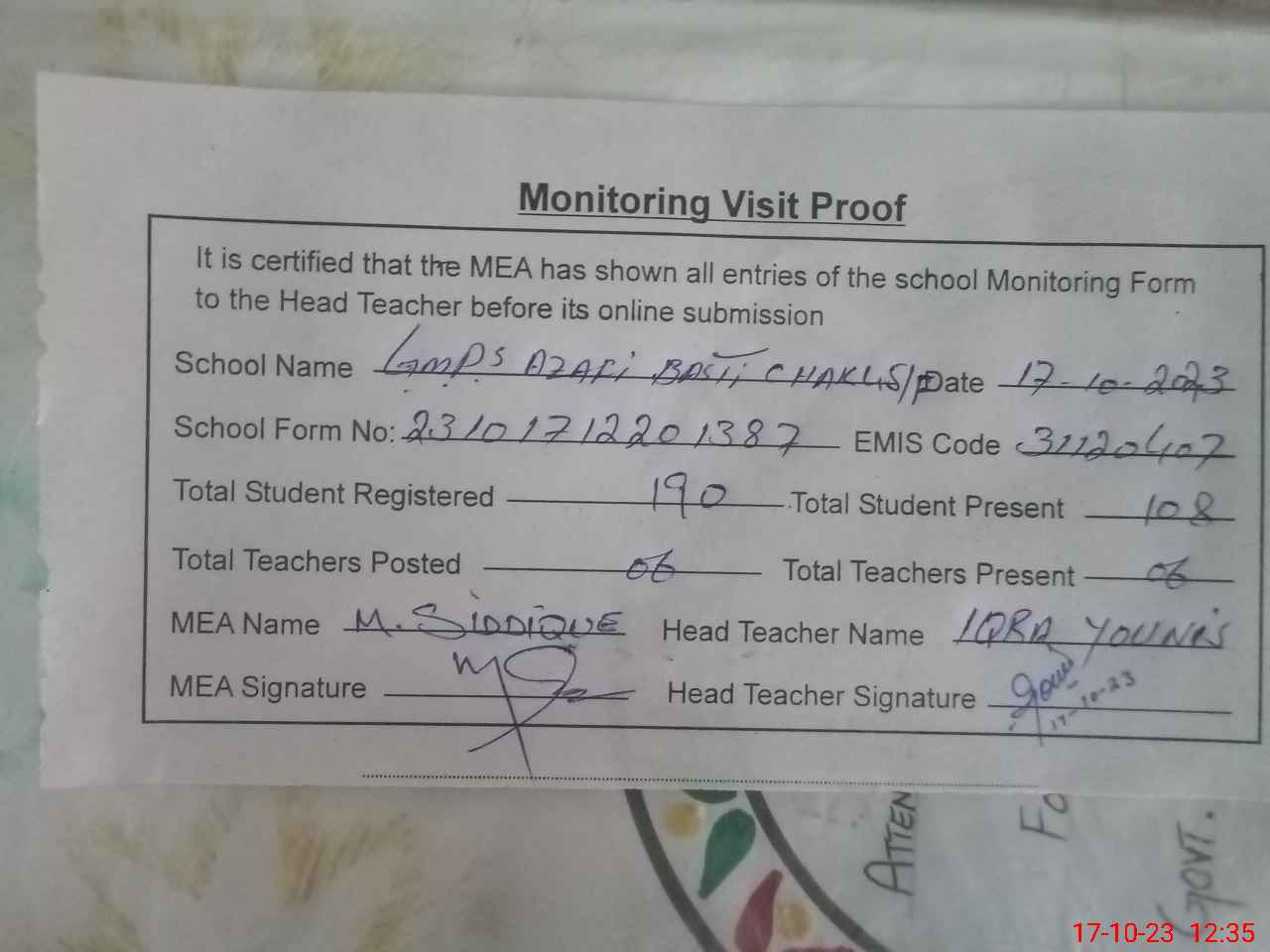 | Attendance Register | Head Teacher | MEA with School | Visit Proof |