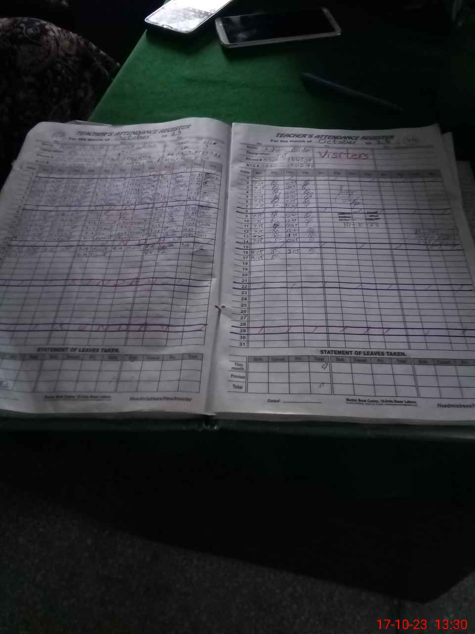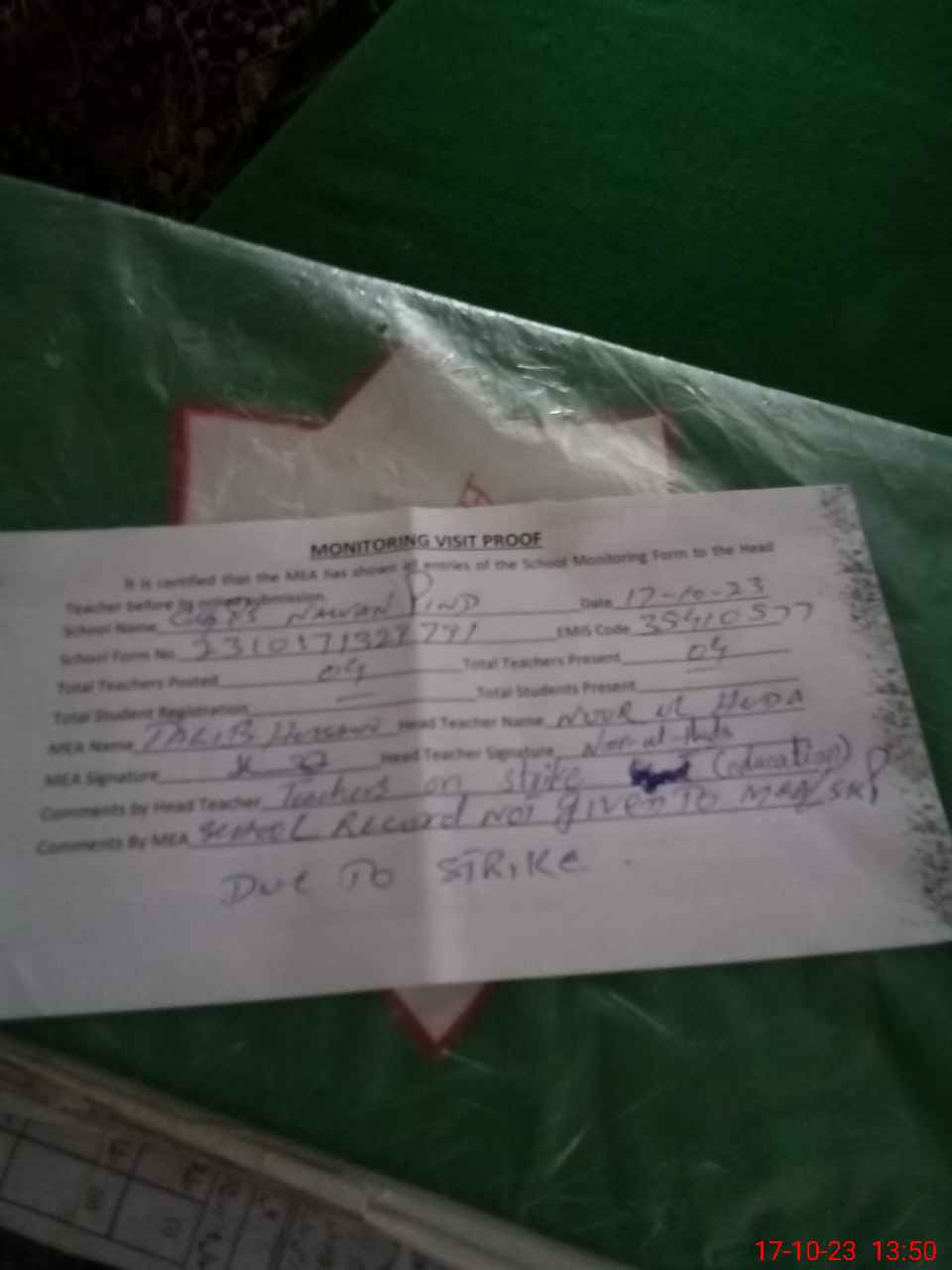 | Total no. of Classrooms: 4 No. of Classrooms Used for Teaching: 4 No. of Classrooms Storing Old Furniture, FTBs, etc: 0Comments if Any: School opened Teaching and non teaching staff are present School information and record not given to Mea Talib hussain due to strike and students education also stoped |
