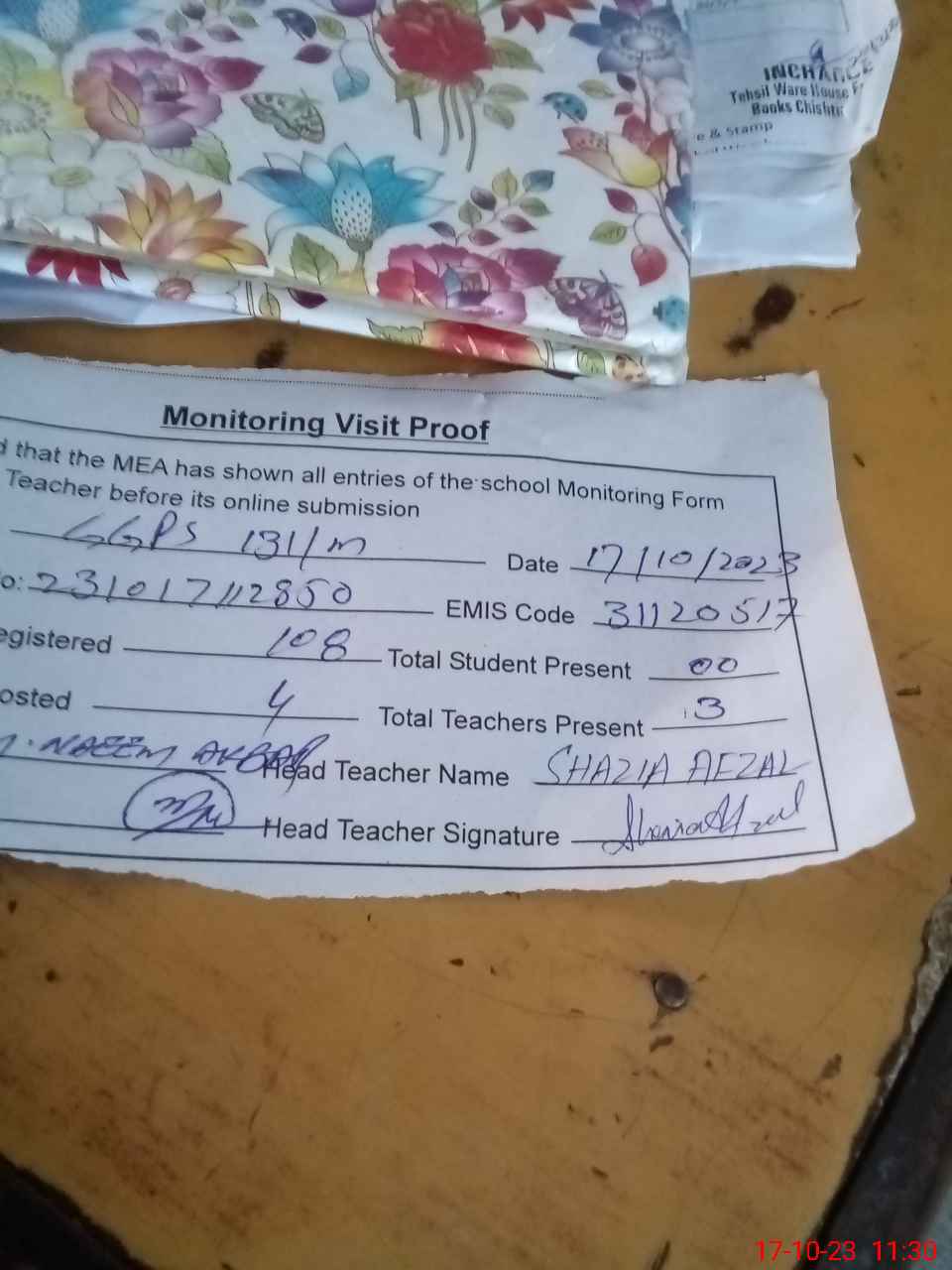 | Attendance Register | Head Teacher | MEA with School | Visit Proof |