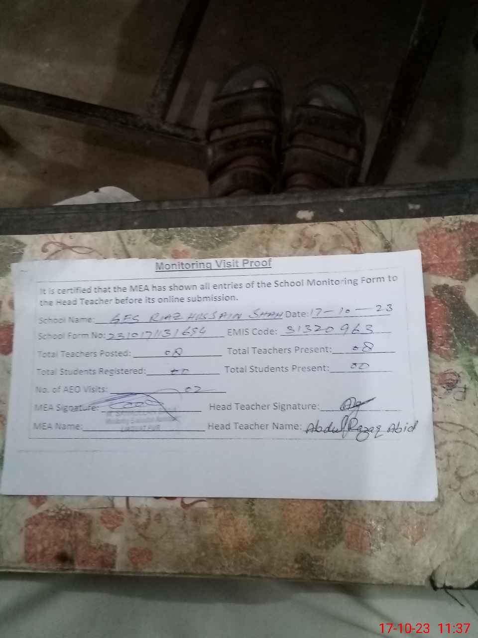 | Attendance Register | Head Teacher | MEA with School | Visit Proof |