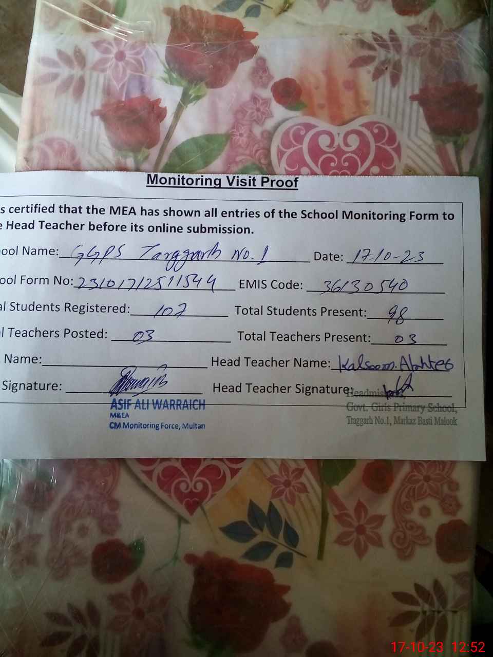 | Name: IR**** NO**** Designation: (School Headmaster's/Headmistress's) HEADMASTER Phone/Cell Number: 03**** |