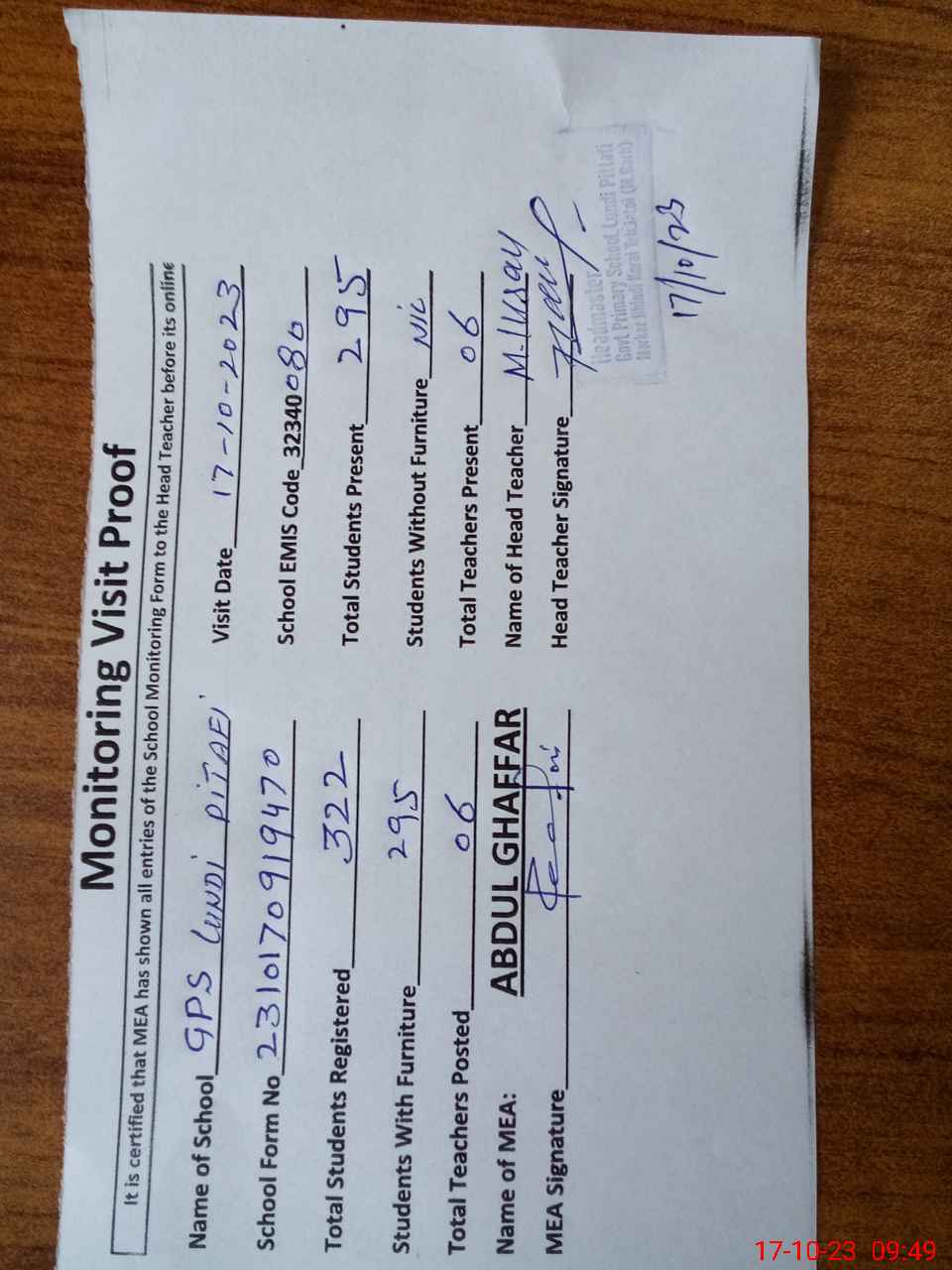 | Attendance Register | Head Teacher | MEA with School | Visit Proof |