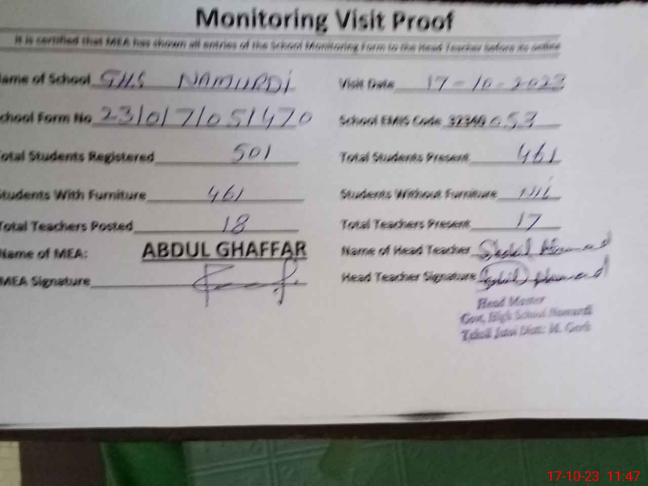 | Attendance Register | Head Teacher | MEA with School | Visit Proof |