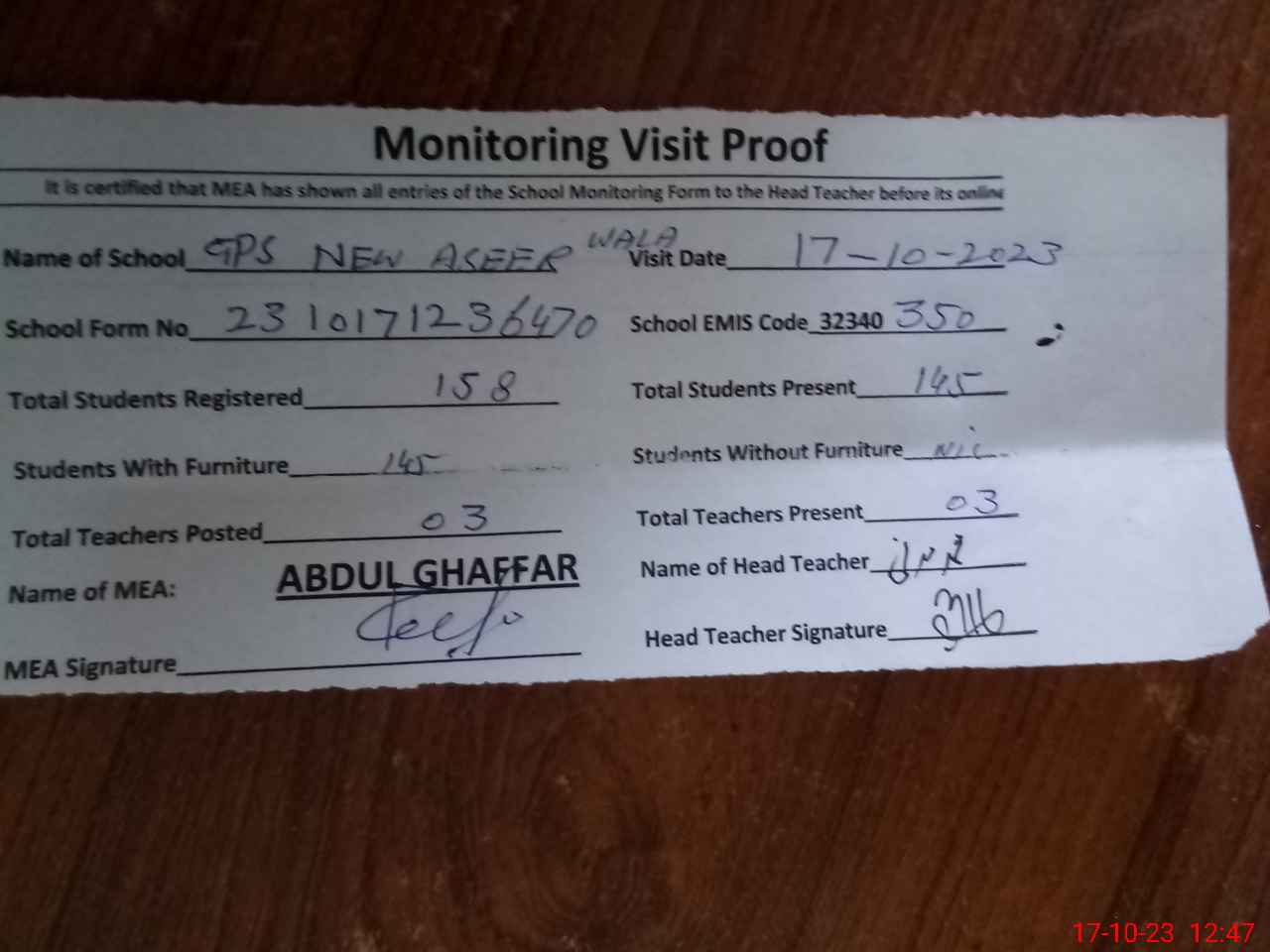 | Attendance Register | Head Teacher | MEA with School | Visit Proof |