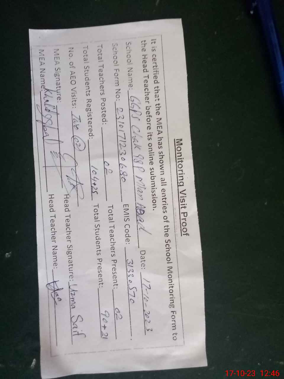 | Attendance Register | Head Teacher | MEA with School | Visit Proof |
