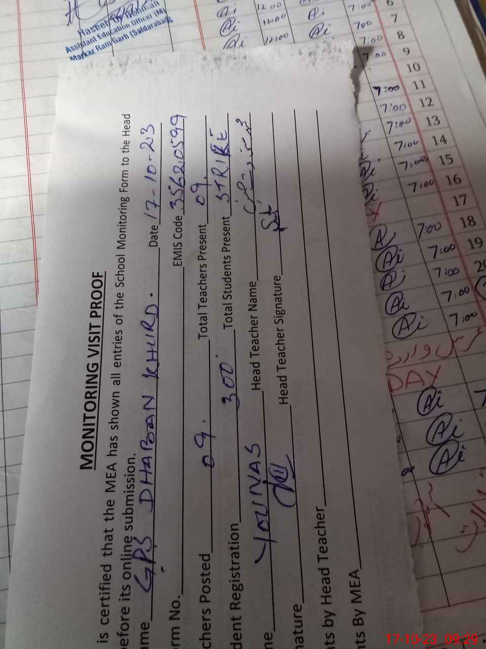 | Attendance Register | Head Teacher | MEA with School | Visit Proof |