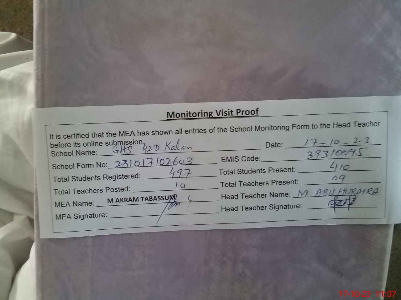 | Attendance Register | Head Teacher | MEA with School | Visit Proof |