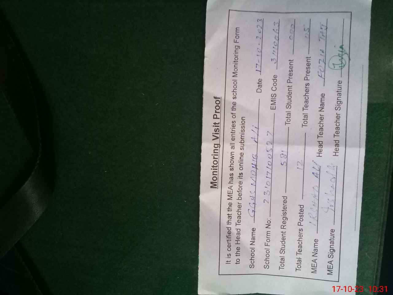 | Attendance Register | Head Teacher | MEA with School | Visit Proof |