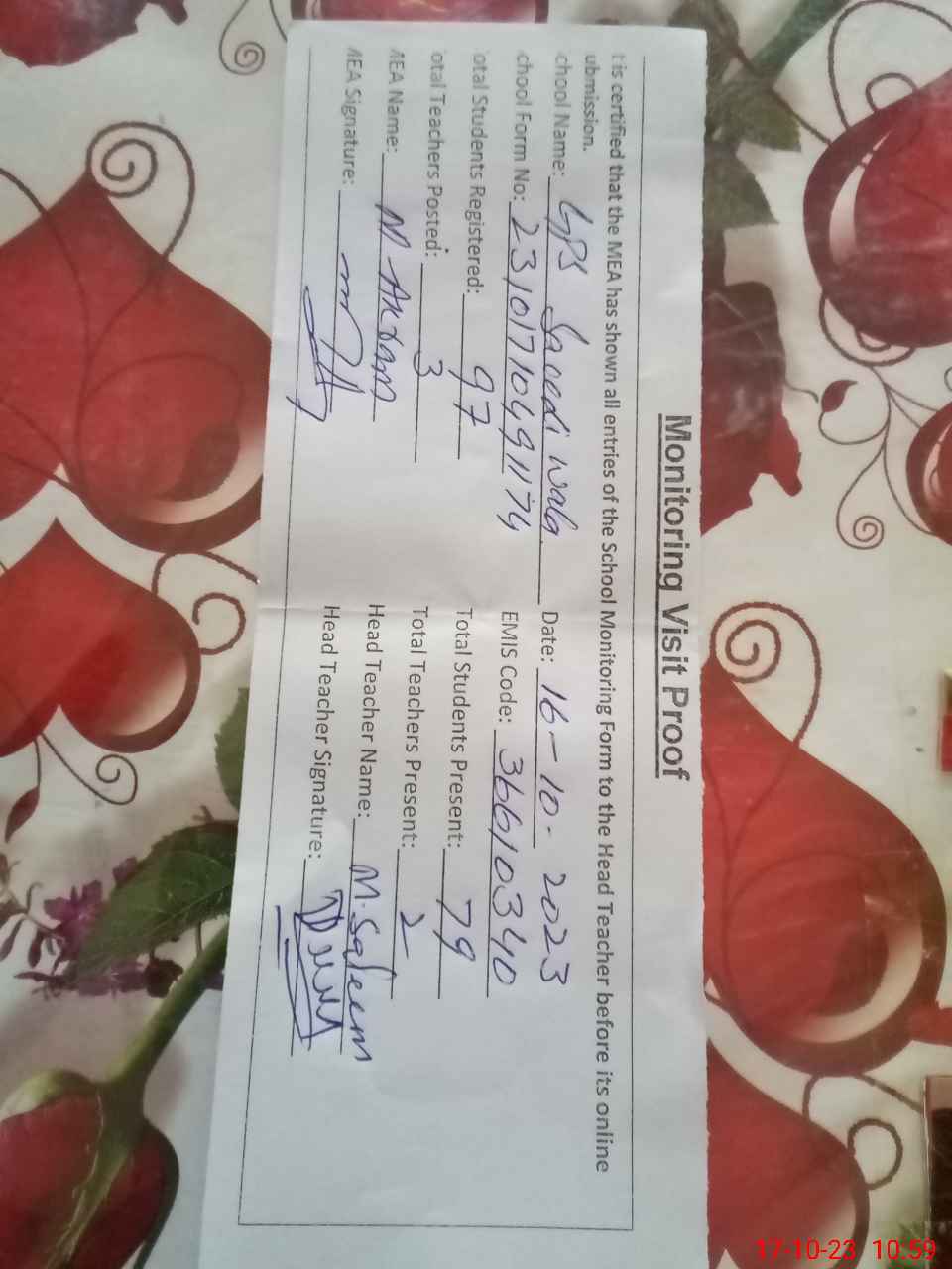 | EMIS Code: 36610340 | Name of School: GPS SAEEDI WALA | |||