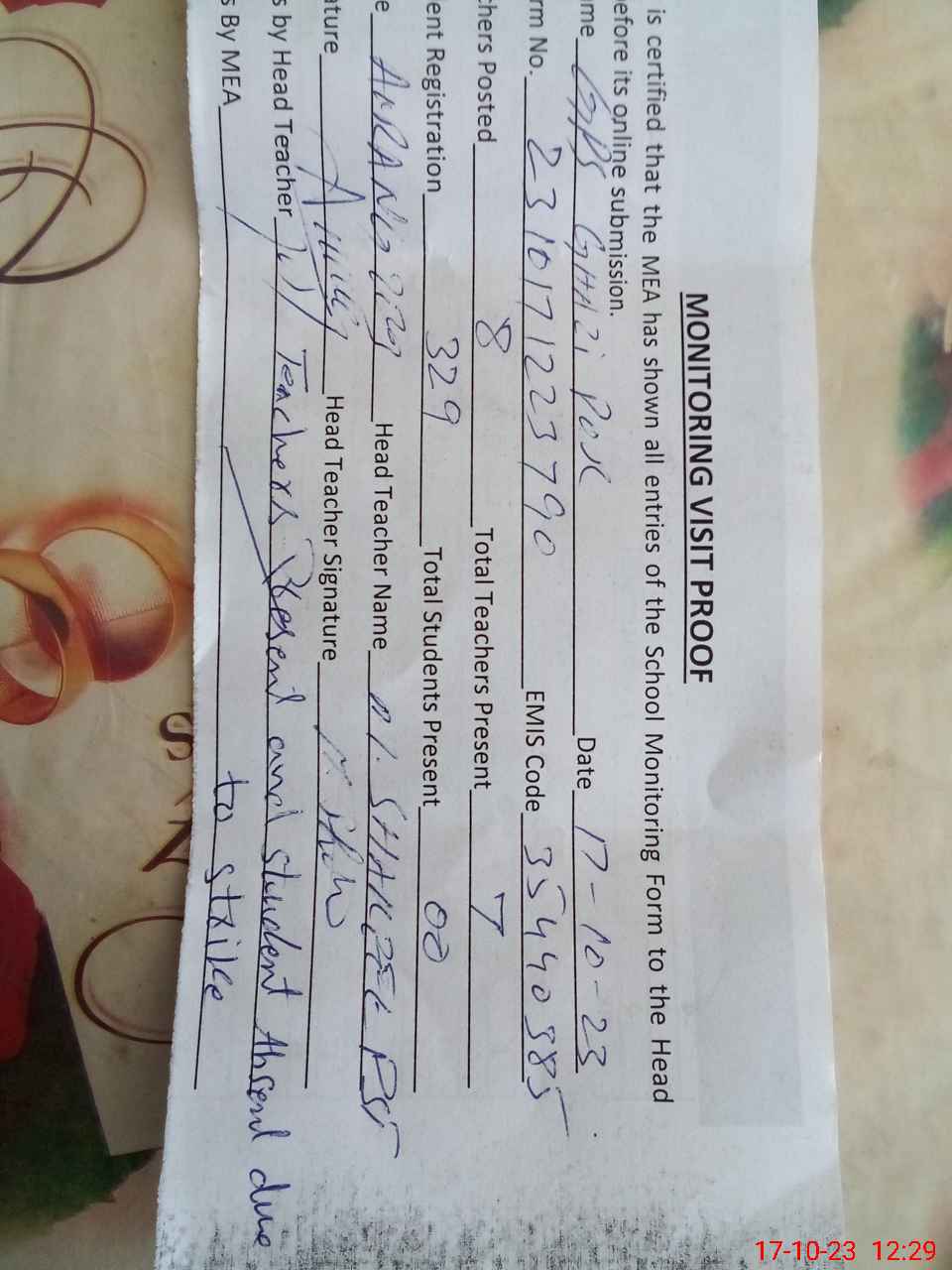 | Attendance Register | Head Teacher | MEA with School | Visit Proof |