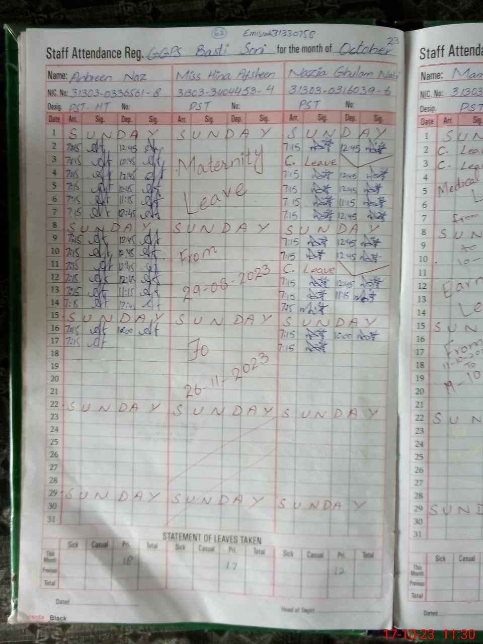 | CNIC | Full Name | Designation | R/C | Absence During Last Calender Month |