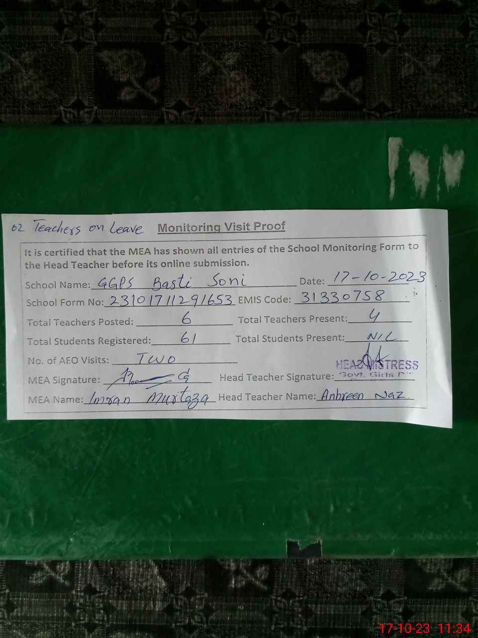 | Attendance Register | Head Teacher | MEA with School | Visit Proof |