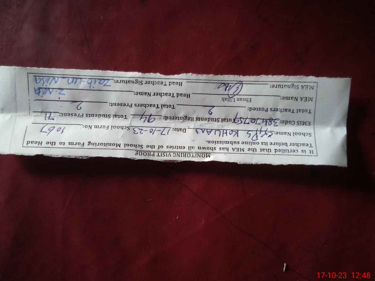 | Attendance Register | Head Teacher | MEA with School | Visit Proof |