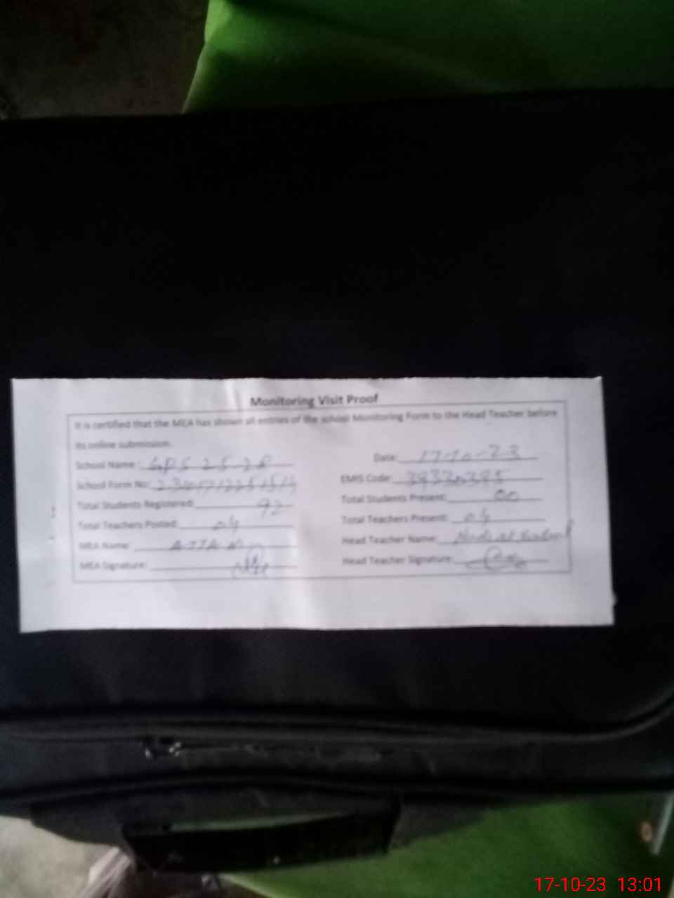 | Attendance Register | Head Teacher | MEA with School | Visit Proof |