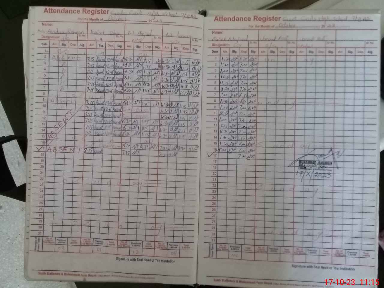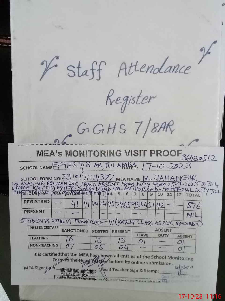 | Remarks (Use Separate Page if Required): MUHAMMAD ASAD UR REHMAN JC FOUND ABSENT FROM DUTY FROM 25 SEPTEMBER 2023 TO TILL UMME KALSOOM EST GENERAL IS ALSO FOUND UN AUTHORISED NO OFFICIAL DUTY TILL THE COMPLETION OF ASSIGNMENT KATCHI STUDENTS ARE WITHOUT FURNITURE AS PER RECORDS NSB GRANTS AND FTF RECORDS ARE NOT AVAILABLE LESSON PLANS ARE NOT AVAILABLE TIME TABLE NOT PROVIDED TODAY STUDENTS ARE NOT PRESENT IN THE SCHOOL FTBS RECORDS IS NOT AVAILABLE | |||||