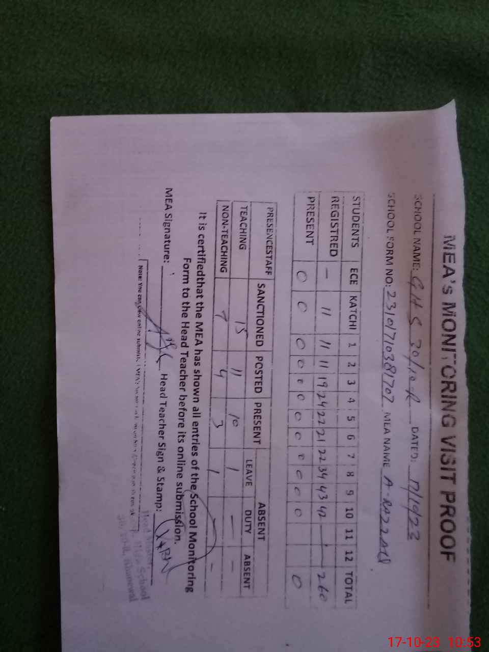 | Attendance Register | Head Teacher | MEA with School | Visit Proof |