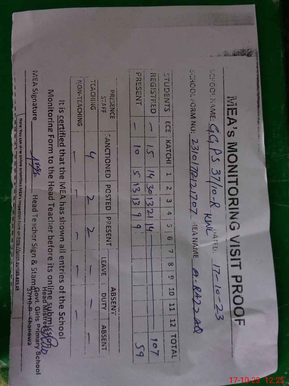 | Attendance Register | Head Teacher | MEA with School | Visit Proof |