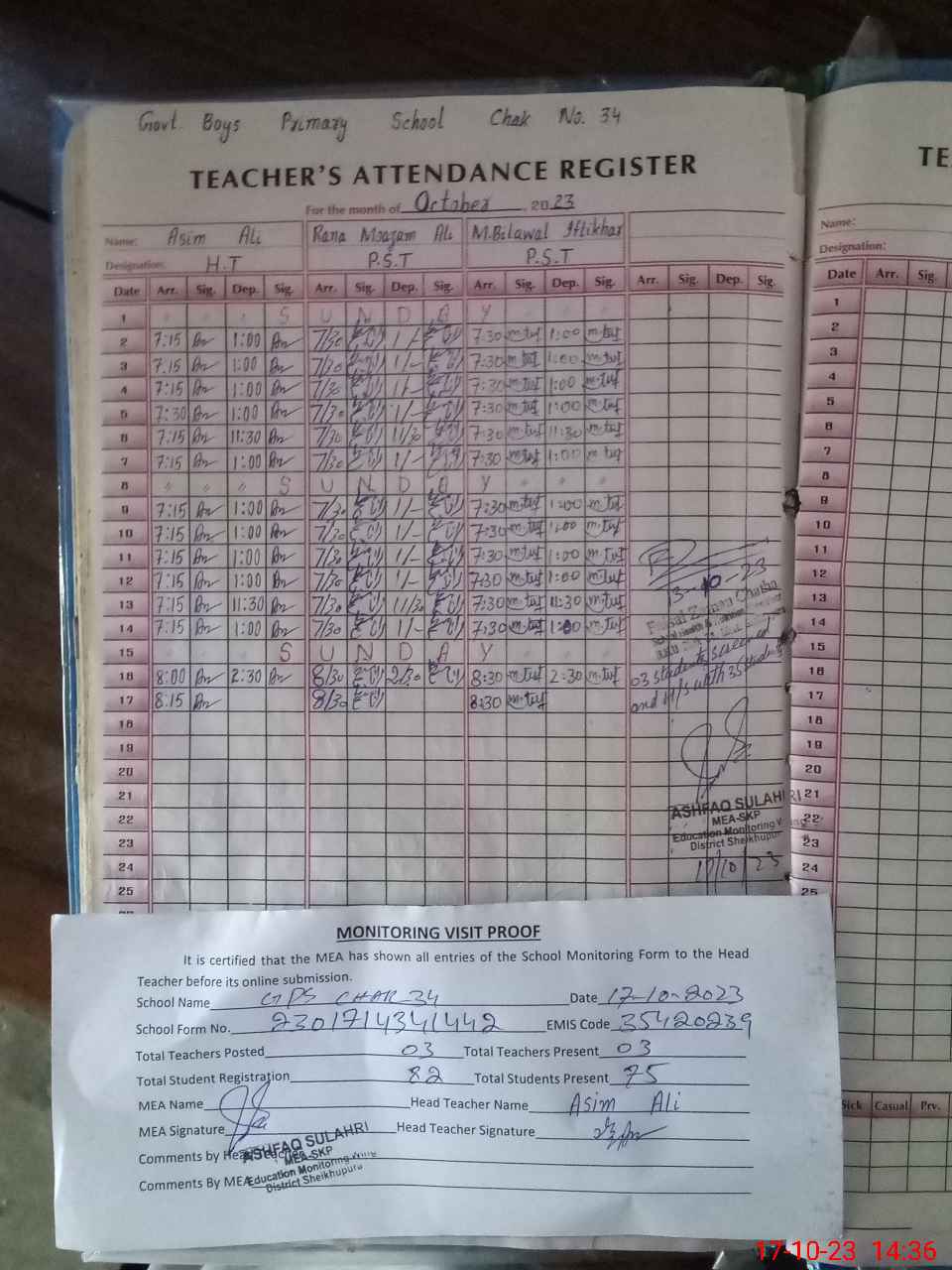 | Attendance Register | Head Teacher | MEA with School | Visit Proof |