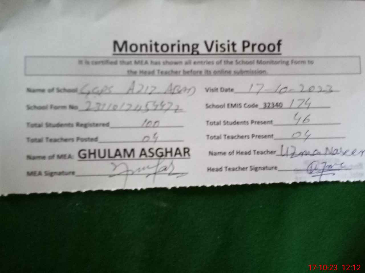 | Attendance Register | Head Teacher | MEA with School | Visit Proof |